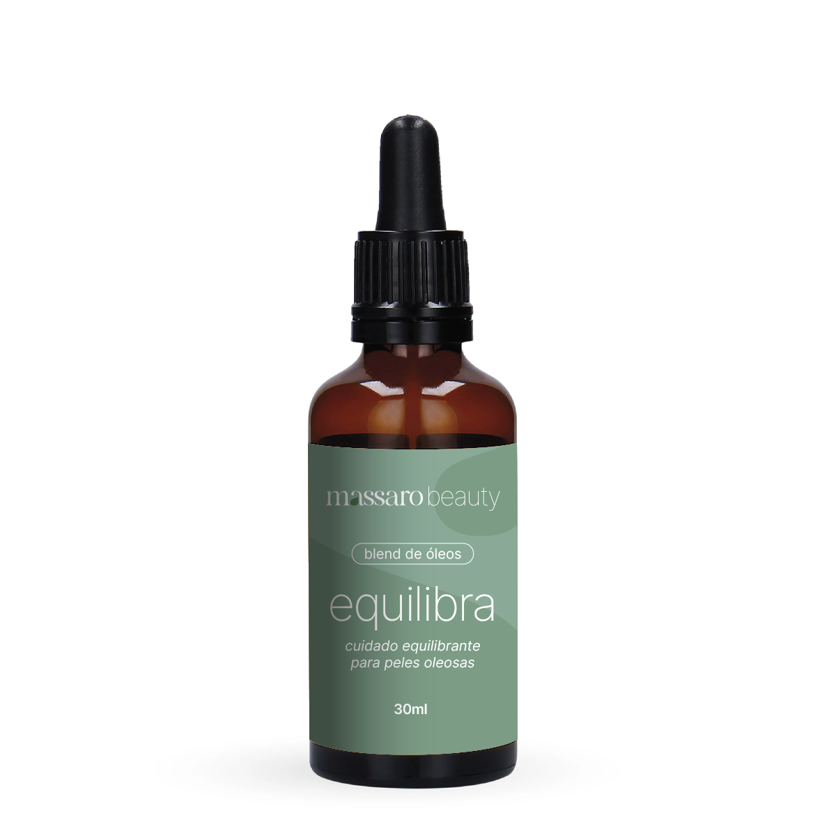 Blend de óleos Equilibra, em embalagem de 30ml. Óleos vegetais (Simmondisia chinensis e Helianthus annuus) e óleos essenciais (Lavandula angustifolia, Rosmarinus offcinalis, Melaleuca alternifolia e Copaifera officinalis). Ideal para garantir o equilíbrio e controle da pele oleosa, sendo uma ótima opção 100% natural para o combate a acne, eczemas, inflamaçoes, incluindo foliculite.
